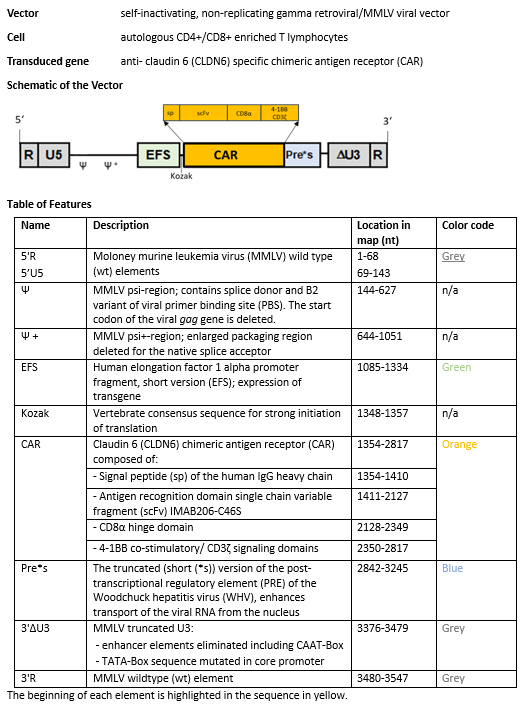 autologous CD4+/CD8+ enriched T lymphocytes obtained by leukapheresis, transduced with a self-inactivating, non- replicating gamma Moloney murine leukemia virus (MMLV) vector encoding a chimeric antigen receptor (CAR) targeting claudin 6 (CLDN6), composed of a human IgG heavy chain signal peptide, a single chain variable fragment (scFv; IMAB206-C46S), a CD8 hinge and transmembrane domain, and a 4-1BB co-stimulatory and CD3ζ intracellular signalling domain, under control of the elongation factor 1 alpha short (EFS) promoter. The vector also contains an MMLV psi- region, an enlarged MMLV psi+ packaging region, a Kozak sequence, and a truncated version of the post- transcriptional regulatory element of the Woodchuck hepatitis virus (WPRE); flanked by 5' and 3' MMLV wildtype long terminal repeats (LTRs). The vector is pseudotyped with gibbon ape leukemia virus (GALV) envelope protein.The leukapheresis material is enriched for CD4+/CD8+ T lymphocytes by positive immunoselection, activated by CD3 and CD28 agonists and transduced with the retroviral vector. The cells are then expanded in media with interleukin 15 (IL-15) and interleukin 7 (IL-7). The T lymphocytes (≥80%; with ≤20% CD3- cells) are positive for the transgene (≥10% CAR positive) and secrete interferon gamma in response to CLDN6 expressing target cells