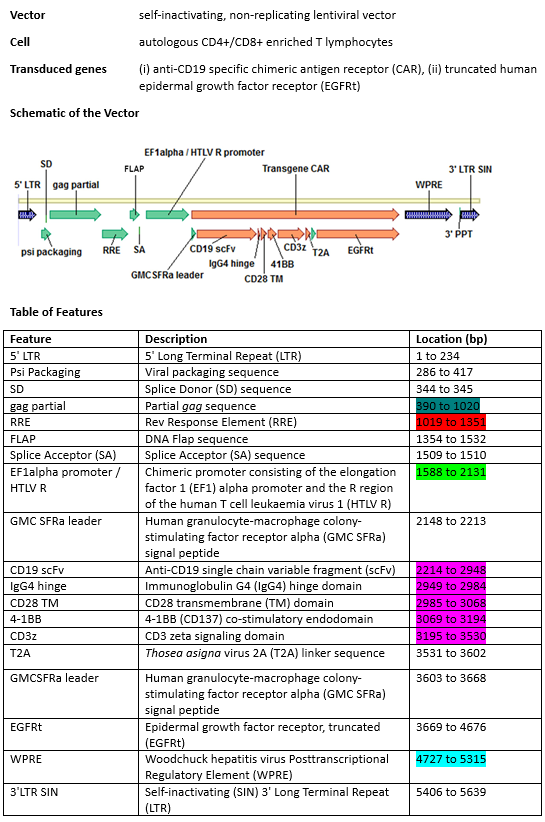 autologous CD4+ and CD8+ T lymphocytes obtained by leukapheresis and transduced with a self-inactivating, non- replicating lentiviral vector encoding (i) a CD19 specific chimeric antigen receptor (CAR) and (ii) truncated human epidermal growth factor receptor (EGFRt) separated from the CAR by a T2A self- cleaving peptide, under control of a chimeric promoter composed of the elongation factor 1 alpha (EF-1α) promoter/R region of the human T cell leukaemia virus 1 (HTLV-1 R) and a Woodchuck hepatitis virus posttranscriptional regulatory element (WPRE). The CD19-specific CAR transgene consists of a single-chain variable fragment (scFv) derived from a CD19-specific monoclonal antibody (FMC63), an IgG4 hinge region, a CD28 transmembrane domain, and the intracellular CD137 (4-1BB) co-stimulatory and CD3ζ signalling domains. Both transgenes, the CD19-specific CAR and the EGFRt, are preceded by human granulocyte-macrophage colony-stimulating factor receptor alpha (GMCSFR-alpha) signal peptide sequence. The vector genome also contains a psi packaging signal, a splice donor, partial gag, Rev response element (RRE), a DNA FLAP, and a splice acceptor. The vector is flanked by 5' and 3' long terminal repeats (LTRs) and is pseudotyped by vesicular stomatitis virus (VSV) G glycoprotein., The leukapheresis material is sorted to co-select the CD4+ and CD8+ T lymphocytes by positive immunoselection prior to activation with CD3 and CD28 agonists in growth media containing interleukin 2 (IL-2), interleukin 7 (IL-7) and interleukin 15 (IL-15)., The mixed CD4+/CD8+ cells are then transduced with the lentiviral vector and minimally expanded in growth media containing IL-2, IL- 7 and IL-15. The cell suspension consists of CD4+ and CD8+ lymphocytes that are ≥80% CD3+ and contain ≥10% CD3+CAR+ cells. The transduced T lymphocytes release interferon gamma (IFN-γ) by co-culture with target cells in vitro