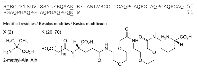 glucagon-like peptide 1(7-37) [human GLP-1(7-37)] (1-31), (A8>2-MeAla2, G22>E16, K34>R28, R36>G30)-variant, fused to the artificial 40-peptide (GAQP)9GQKP (32-71), substituted at N6 of each of the two lysyl residues 20 and 70 with a (22S)-22,40-dicarboxy-10,19,24-trioxo-3,6,12,15-tetraoxa-9,18,23-triazatetracontan-1-oyl group